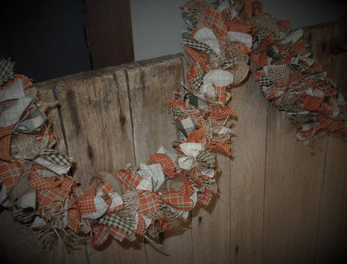 Farmhouse Fall Lighted Rag Garland~Rustic Home Fall Garland~Orange Sage Cream Homespun Fabric~Lighted Primitive Swag~Rustic Mantel Decor