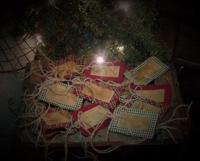 Homespun Hang Tag Set~Olde Thyme Christmas~Gift Tag Set~Barn Red~Sage~Plaid~Twine Bow Accent~Aged~Frayed~Handmande